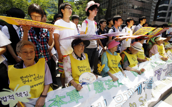 이날 수요집회에 참여해 연사들의 발언을 듣고 구호도 따라 외치던 경기 안산 동산고등학교 학생들이 내려쬐는 땡볕에 위안부 할머니들이 힘들어하자 들고 있던 손팻말로 그늘을 만들어주고 있다. 이날 행사에는 오는 12월14일 1천 회째를 맞는 것을 기념해 서울 종로 일본대사관 앞 수요집회 장소를 ‘평화로’라 부르고 그곳에 ‘평화비’를 세우기 위해 서로 뜻을 모으고 뜻을 이어주자는 희망 릴레이 발대식도 함께 열렸다. 할머니 세대의 아픔을 배우고 체험한 학생들의 숙연한 표정. 평화를 갈망하는 마음이 세대와 세대로 이어지는 뜻깊은 행사였다. 사진·글 김경호 기자 jijae@hani.co.kr
