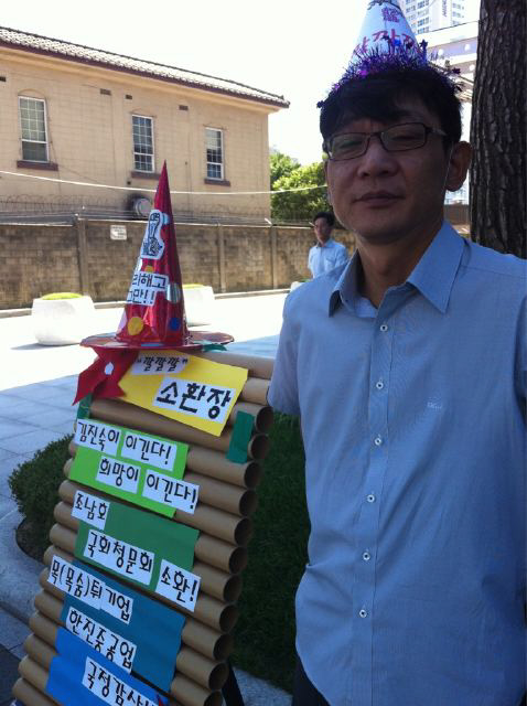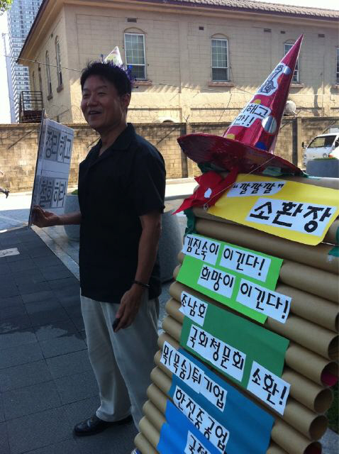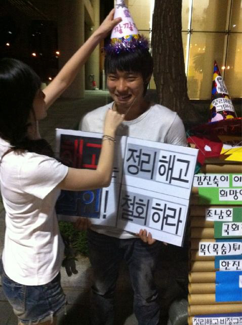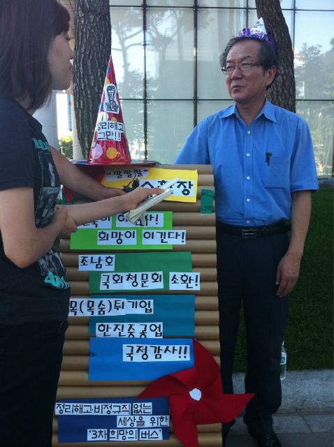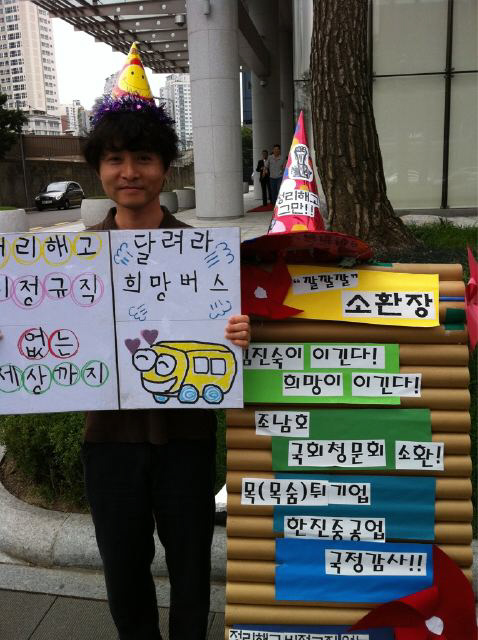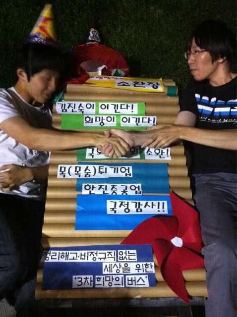 지난 7월20일부터 30일까지 서울 용산구 한진중공업 본사 앞에는 한시도 빠짐없이 ‘해고는 살인! 정리해고 철회하라!’는 피켓이 있었다. 그냥 놓인 것이 아니라 누군가의 가슴에 새겨서. 고등학생, 젊은 연인, 아기를 품에 안은 한 가족, 해고 노동자, 영화감독, 변호사, 대학교수…. 다양한 신분의 사람들 240명이 간절한 마음을 이어가며 하루 24시간을 낮에는 경찰과 밤에는 독한 모기와 싸워가며 ‘주경야독’ 1인시위를 했다. 희망의 버스 기획단은 “한진중 본사를 압박하고 정리해고 문제 해결을 원하는 시민의 의지를 보여주려고 이번 (연쇄) 1인시위를 기획했다”고 밝혔다.