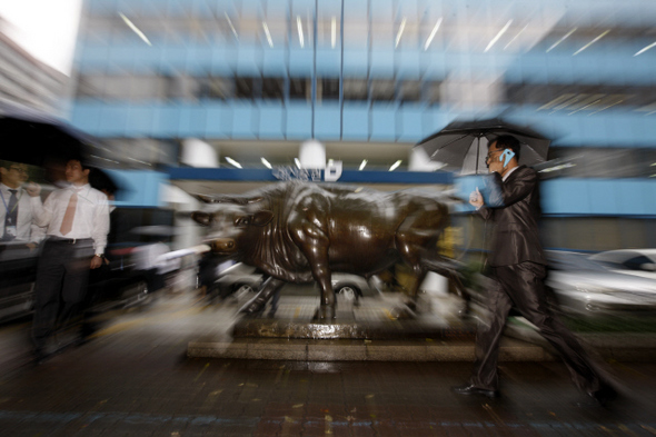 99%의 시민들이 1%도 채 되지 않는 월가의 탐욕에 대항해 전세계 금융자본의 본거지인 월가에서 점령 투쟁을 벌이고 있다. 한국의 금융 상황도 미국과 크게 다르지 않다. 금융권은 수조원의 수익을 내고 있고, 극소수의 대주주를 위한 고배당과 각 은행 임원들의 고액 연봉은 많은 시민의 절망과 분노를 일으키고 있다. 손실을 보면 세금으로 틀어막아야 하는데, 이익은 자기네끼리 나눠먹는 금융권의 얌체 행보에 대한 불만이 하늘을 찌른다. 금융소비자권리찾기연석회의 투기자본감시센터, 금융소비자협회 등 시민사회단체가 10월15일 오후 2시 ‘여의도를 점령하라’ 집회를 열어 ‘금융자본의 탐욕 그 자체에 대한 규제’ ‘금융자본의 탐욕과 결탁해 직무유기와 직권남용을 저지른 금융관료와 금융정책에 대한 책임 규명’ ‘금융자본에 의한 피해자 구제 및 금융소비자와 정리해고자 등에 대한 배상과 복직’ 등을 요구했다. 집회가 열리기 하루 전인 14일 낮 증권 종사자들이 서울 여의도 증권가의 황소상 앞을 지나고 있다.