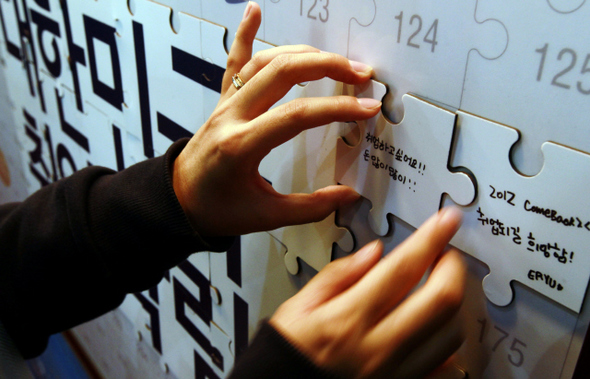 통계청이 11월9일 “10월 실업률이 지난해 같은 기간보다 0.4% 하락한 2.9%를 기록했다”고 발표하자, 박재완 기획재정부 장관은 “고용 대박”이라고 말했다. 뜬금없다. 고용률은 경제협력개발기구(OECD) 34개 회원국 중 21위에 불과할 정도로 하위권이고, ‘대졸자 절반이 백수’라는 자조 섞인 표현이 나오는 게 현실이다. 절망에 빠진 구직포기자를 배제하고 내는 통계 숫자 하나만 가지고 ‘고용 대박’ 운운하는 관련 부처 장관을 보고 있자니 헛웃음만 나온다. 11월11일 서울 양재동 AT센터에서 열린 ‘2011년 대한민국 취업박람회’에 참가한 한 구직자가 취업하고픈 간절한 소망을 적어 퍼즐판에 끼우고 있다. 첫 눈이 내리기 전에 소망이 이뤄지길! 사진·글 정용일 기자 yongil@hani.co.kr