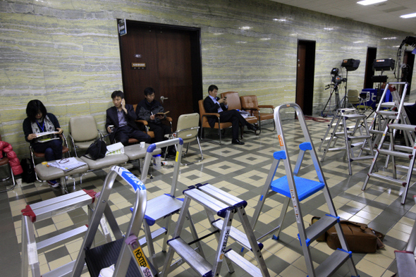 지난 11월17일 오후 한-미 FTA 비준안을 다루는 국회 외통위 회의장 앞에서는 여당의 기습 상정을 저지하려는 야당의 당직자들이 회의장 출입구를 막은 채 지키고 있다. 충돌 순간에 대비한 언론사들의 촬영용 사다리가 어지럽게 흩어진 채 을씨년스러운 풍경을 연출하고 있다. 폭풍 전야의 고요함이다. 탁기형 선임기자 khtak@hani.co.kr
