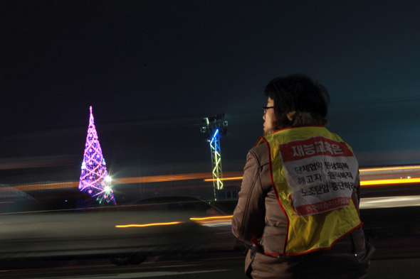 재능교육은 학습지 교사들은 노동자가 아니라고 주장했다. 그리곤 노조 활동을 한 조합원들을 해고했다. 법과 공권력은 회사 편을 들었다. ‘재능 선생님 해고노동자들’의 농성은 그래서 시작됐다. 조합 활동 인정과 단체협약 체결이라는 요구 사항을 내걸고. 2011년 12월14일로 1455일째를 맞았다. 서울 중구 을지로1가 재능교육 사옥 앞에서 농성 중인 오수영(38)씨가 영하로 떨어진 겨울의 칼바람을 맞고 있다. 어둠이 짙게 내린 세밑의 서울광장을 밝히는 성탄 트리는, 누구의 삶과 꿈을 비추려는 것일까.