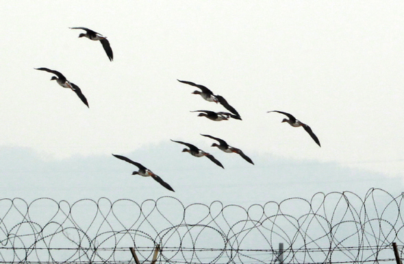 북한 김정일 국방위원장의 영결식이 열린 2011년 12월28일 오전 경기 파주시 임진각 철책선 위로 기러기떼들이 날아가고 있다. 새들에게 남과 북의 구분은 무의미하다. 자유롭다.