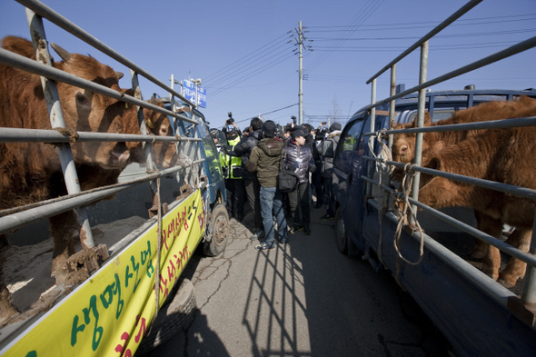 전국한우협회 경기지부의 축산 농민들이 한우값 폭락에 항의, 곤지암 공용주차장에 모여 청와대로 갈 예정이었으나 경찰의 저지로 무산 되었다./2012.1.5./한겨레21박승화