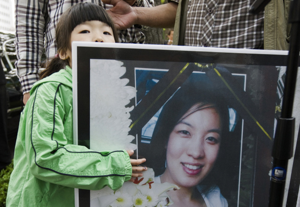 삼성전자 반도체 온양공장에서 6년간 일하다 발병한 악성 뇌종양으로 지난 7일 숨진 고 이윤정씨의 노제가 삼성본관 앞에서 열렸다./2012.5.10/한겨레레21박승화