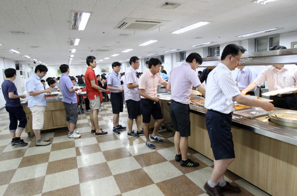 서울시청 남산별관 구내식당에서 6월1일 반바지와 샌들 차림의 공무원들이 점심 식사를 하려고 줄을 서 있다. 서울시는 여름철(6월1일~9월21일) 에너지 사용을 줄이려고 공무원들에게 ‘쿨비즈’(Cool Biz) 복장으로 출근하도록 했다. 시민과 접촉하는 민원부서 공무원들은 공직 예절과 품위를 유지해야 한다며 제외했다. 남산별관에서 근무하는 서한호(46) 주무관은 “사무실 온도를 28℃ 이상으로 유지해야 한다. 아직은 출근길이 어색하지만 본격적인 여름이 시작되면 진가를 발휘할 것 같다”고 말했다. 서울시의 쿨비즈 복장 허용은 2014년까지 원자력발전소 1기 전력생산량을 줄이는 ‘원전 하나 줄이기’ 종합대책의 하나다.