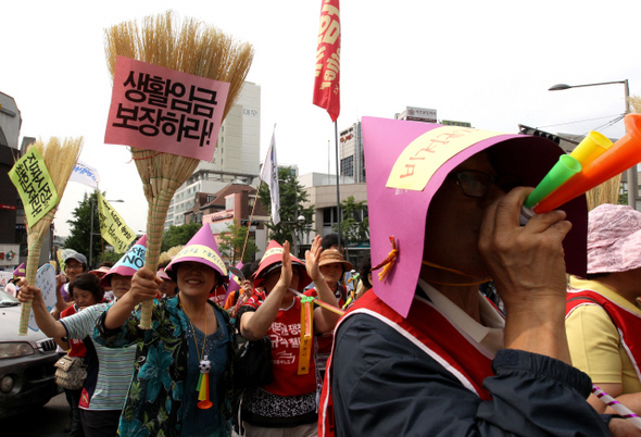 최근 성폭력 문제를 제기한 서울대의 한 청소노동자가 해고돼 논란이 일고 있는 가운데 청소노동자들이 지난 6월15일 오후 서울 홍익대 앞에서 인권과 최저임금 보장, 비정규직 철폐 등을 요구하는 거리행진을 하고 있다. 2010년 6월5일을 시작으로 매년 6월에 열리는 청소노동자 행진은 올해로 3회째다. 따뜻한 밥을 먹을 권리도 제 몸 하나 쉴 공간도 없이 이 사회의 ‘유령’이거나 ‘병풍’ 같은 존재로 살아가는 청소노동자는 80% 이상이 여성이고, 그중 절반가량이 60살 이상 고령자다. 이들에게 지워지는 저임금과 열악한 노동환경, 인격적 멸시와 성희롱…. 이 모든 것을 방치하는 사회의 더러운 양심은 누가 청소할 것인가?