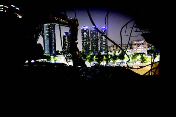 4구역 길 건너편에 위치한 용산역 앞 3구역은 재개발이 진행되고 있다. 지난 7월9일 철거 중인 3구역 건물의 옥상에 올라서자 화려한 불빛을 뽐내고 있는 고층 빌딩과 철거 중인 건물 잔해들이 극명한 대조를 이뤘다. 공사장 가림막에는 ‘갈 곳 없는 철거민 여기가 무덤이다’라고 쓰인 대형 펼침막이 걸려 있다. 평생을 일궈온 삶의 터전을 얼마 안 되는 보상금과 바꿔야 하는 세입자들의 저항은 현재진행형이다. 용산 참사는 아직 끝나지 않았다.