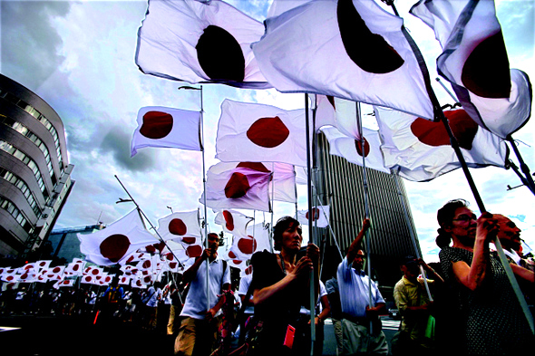 지난 8월15일 제2차 세계대전 패전 67년을 맞아 일본 도쿄 야스쿠니신사 부근에서 일본 우익단체 ‘힘내라 일본’(간바레 니폰) 회원들이 행진하고 있다. 한국과 일본, 중국 사이의 영토 갈등이 점점 높아지는 가운데 이들은 한국과 중국 정부에 항의하는 의미로 반기(조기)의 일장기를 들고 제2차 세계대전 전몰자들뿐만 아니라 전범의 위패가 안치된 야스쿠니신사로 향했다. 해가 기울어가는 오후, 거센 바람에 나부끼는 깃발을 든 비장한 표정의 사람들. 누군가의 눈에는 이들이 든 깃발이 전쟁의 망령에 흔들리는 적반하장의 깃발로 보인다.