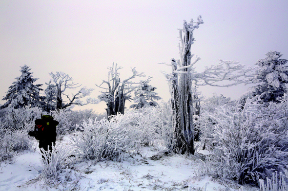 흐린 하늘에서 이따금 눈발이 휘날리던 11월13일 오전. 턱에 닿을 듯 거칠게 숨을 몰아쉬며 오른 태백산(해발 1567m, 강원도 태백시 소도동) 정상에는 천상의 눈 세계가 펼쳐졌다. 살아서 천년, 죽어서 천년을 간다는 태백산 정상 부근의 주목 군락지에 쌓인 눈이 마치 다른 세상인 듯한 풍경을 연출해내며 탄성을 자아내게 한다. 10월30일 설악산에 올가을 들어 첫눈이 내린 뒤 지역별로 겨울을 알리는 첫눈 소식이 이어지고 있다. 예년보다 일찍 추위가 찾아온 올해는 어느 해보다 추운 겨울이 예상된다는 기상청의 예보도 있다. 불황의 그늘에서 고난한 삶을 이어가는 시민들에게 더 힘든 계절이 될 것으로 보인다.