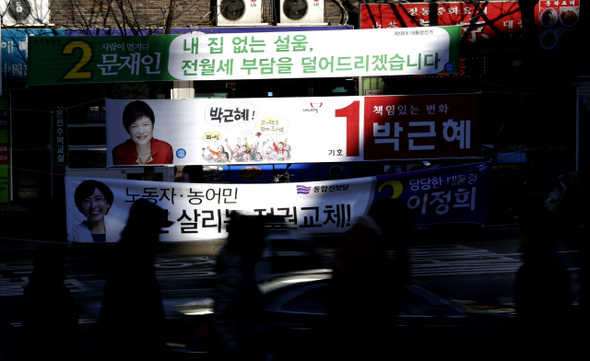 제 18대 대통령 후보자들을 홍보하는 대형펼침막들이 29일 오후 서울 서대문구 홍제동 홍제삼거리에 걸려 있다. 김명진 기자 littleprince@hani.co.kr