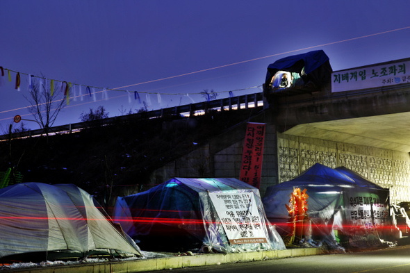 2012년 임진년이 가고 있다. 거리에는 성탄과 연말을 알리는 조명들이 반짝이고 사람들은 새해 소망을 얘기한다. 하지만 지상에서 묵은해를 보내고 새해를 맞지 못하는 사람들이 있다. 충남 아산 공장 인근 도로 6m 높이의 굴다리에서 농성 중인 금속노조 홍종인 유성기업 지회장과 현대차·쌍용차·전북버스 노동자들이다. 그들은 비정규직 차별 철폐, 부당해고 무효 등을 외치며 싸우느라 여느 해보다 매서운 추위에도 60일 넘게 굴다리, 송전탑에서 고공농성을 하고 있다.