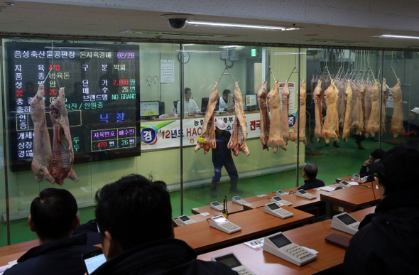 한돈 농가의 시름이 깊어지고 있다. 사룟값은 올라가는데 돼지고깃값이 몇 달째 급락하고 있다. 전국 평균 경매 낙찰가는 kg당 2900원, 지난해 같은 기간에 5천원이 훨씬 넘게 팔리던 것에 비하면 절반 수준이다. 지난해 구제역 여파로 생산량이 줄어들자 가격을 안정시키겠다며 돼지고기를 다량으로 수입한 것이 원인이 됐다. 삼겹살만 고집하는 소비 형태도 한 원인이다. 돼지고기 소비 촉진을 위해 2011년 만들어진 삼겹살데이(3월3일)를 앞둔 2월 마지막 날, 충북 음성 축산물공판장에서 돼지고기 경매가 진행되고 있다.