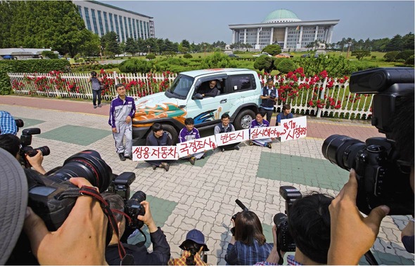 지난 6월5일 서울 여의도 국회 앞에서 이색적인 신차 발표회가 열렸다. 차량 주변으로 뜨거운 태양이 화려한 조명처럼 내려쪼이고 활짝 핀 장미가 무대장치처럼 둘러섰다. 지난 5월 한 공업사에서 쌍용자동차 해고노동자들이 ‘2만 명의 마음이 2만 개의 부품을 모아 자동차를 만드는 H-20000 프로젝트’ 행사를 벌였다(962호 포토² ‘세상에 단 하나뿐인 차’ 참조). 화가와 디자이너가 민들레꽃 그림을 자동차에 그려놓았다. 이 세상 하나뿐인 차에 더 많은 차를 만들고 싶은 염원을 담았다. 차량 앞에서 쌍용차 해고노동자들이 국회가 약속한 쌍용차 국정조사 실시와 해고자 복직을 촉구하고 있다.