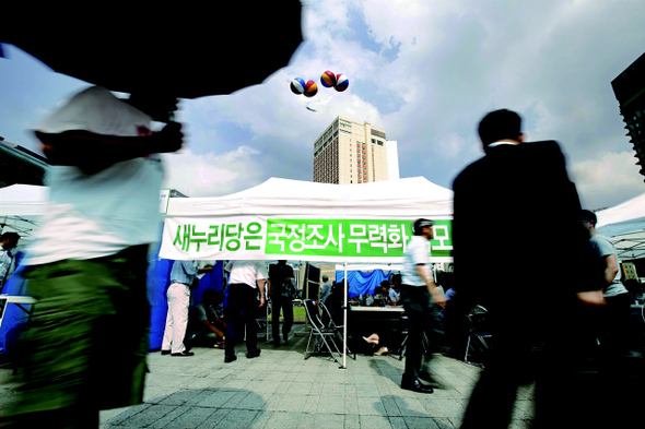 국가정보원 대선 개입 사건의 국정조사 협상 결렬로 민주당이 원외투쟁을 선언하고 거리로 나섰다. 지난 8월1일 민주당의 ‘민주주의 회복과 국정원 개혁 국민운동본부’ 천막이 차려진 서울시청 앞 광장으로 시민들이 지나가고 있다. 그동안 국정원의 정치 개입 실상을 밝히고 근본적인 개혁을 위해 노력해야 할 야당이 새누리당의 물타기에 뒷북만 치며 끌려다녔다. 답답한 정치 상황에 시민들은 거리로 나가 촛불을 들고 종교·시민 사회단체가 시국선언을 계속하며 국정원의 헌법 유린을 규탄했지만, 정부·여당은 국정조사만 무력화하면 잠잠해질 것이라는 계산으로 억지와 물타기, 궤변 등으로 일관해왔다. 정부·여당이 이처럼 국민을 우습게 아는 것에 무기력한 야당도 한몫하고 있다. 만시지탄의 야당, 보수언론과 정부·여당의 파상 공세를 막아내면서 버틸 수 있을까? 시민들의 분노는 더욱 커져가고 있다.