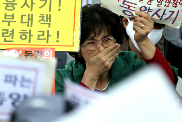 10월9일 서울 여의도 금융감독원 앞에서 동양 채권자 비상대책위원회 주최로 열린 동양그룹과 금융 당국 규탄 집회에서 한 투자자가 피해 대책 마련을 요구하며 눈물을 흘리고 있다. 몇 년 전부터 재무구조에 빨간불이 켜진 동양그룹은 구조조정에 적극적으로 나서는 대신 부실기업 어음 돌려막기 등으로 사태를 악화시켰다. 금융계열사 직원들에겐 회사채와 어음 판매를 강요하면서 절대 망하지 않는다고 개인 투자자들을 유인했다. 하도급 업체에 회사채를 강제로 떠안긴 사례도 발견됐다. 거기다 막판엔 대주주 일가가 대여금고에서 거액의 자금을 인출한 사실도 밝혀졌다. 금감원은 2008년 이후 여러 차례 불완전판매와 우회어음 발행을 비롯한 위법행위를 적발하고도 가벼운 제재와 묵인에 그쳐 결과적으로 동양그룹 사태를 방조했다. 노후자금·결혼자금 등을 묻어두었다 하루아침에 날리게 된 개인 투자자들에게만 그 책임을 물을 수 없는 이유다.