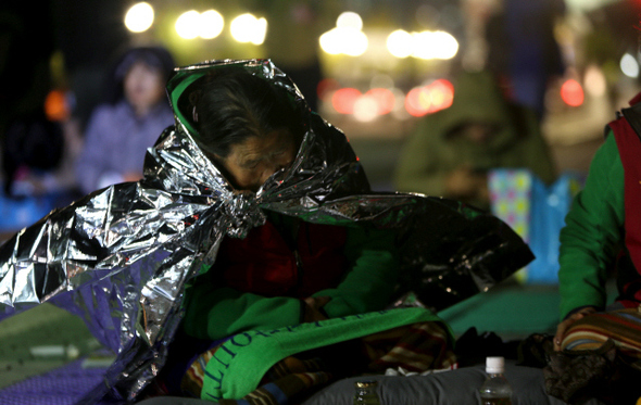 국회 산업통상자원위원회의 한국전력공사에 대한 국정감사가 열리기 하루 전인 10월24일 밤, 서울 여의도 국회 정문 앞에서 경남 밀양의 송전탑 건설에 반대해온 주민들이 공사 중단을 요구하며 노숙농성에 들어갔다. 이 농성에 참여한 팔순의 조필금 할머니가 추위를 견디기 위해 과수원에서 쓰는 은박 비닐을 몸에 두른 채 앉아 있다. 다음날 새벽은 전국적으로 강한 바람이 불면서 서울의 기온이 최저 5.5℃까지 뚝 떨어지는 추운 날씨를 기록했다. “송전탑으로 인해 마을 주민들이 갈가리 찢어지고 25일 동안 무덤 같은 흙구덩이에 있었다. 이게 무슨 꼴인가? 죽을 때가 됐지만 이런 꼴은 처음 본다”는 노인들의 절규는, 그러나 민의의 전당인 국회 담을 넘지 못했다. 핵발전소를 둘러싼 이익은 ‘핵마피아’라 불리는 몇 안 되는 기업과 관리들이 챙기고 편리는 다수의 도시민들이 누리면서 시골에 사는 소수의 노인들만 고통을 짊어지는 현재의 핵에너지 정책은 지속 가능한가? 찬바람에 떨고 있는 노인들이 묻고 있다.
