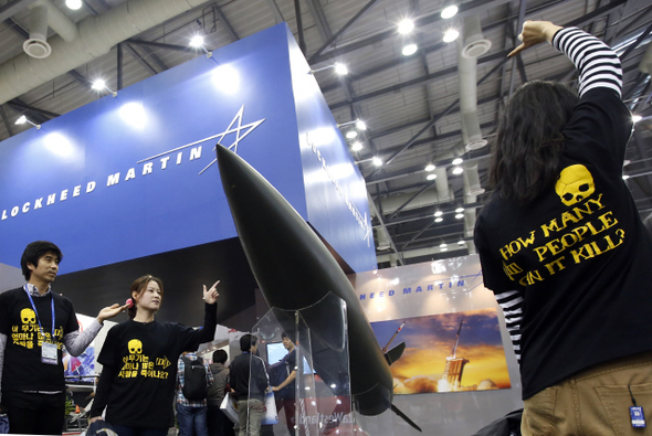 지난 11월1일 ‘2013 서울 국제 항공우주 및 방위산업 전시회’가 열린 경기도 고양시 일산서구 대화동 킨텍스에서 반전평화네트워크 ‘전쟁없는세상’ 회원들이 살상무기를 대하는 퍼포먼스를 하고 있다. 2012년 스웨덴 스톡홀롬국제평화연구소(SIPRI)의 발표에 따르면 2007~2011년 5년 동안 한국은 전세계 재래식 무기시장에서 세계 2위의 무기수입국으로 등극했다. 세계 최고 수준(?)의 무기수입국이지만 전시작전권은 한사코 안 갖겠다는 나라의 국방장관은 ‘한국형 미사일방어체제를 구축하겠다’고 밝혀 오히려 군비경쟁을 더욱 가속화하겠다는 의지를 드러냈다. 방위산업체는 국민의 불안감을 먹고 자라왔다. 한반도의 위기감이 고조될수록 수혜자는 국민이 아닌 그들이었다. 이곳에 전시된 무기는 우리의 안전을 지켜줄 수 있을까? 정말 천문학적인 돈을 들여 구입한 무기는 우리의 평화를 지켜줄까