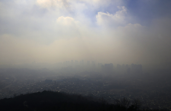 우리나라를 뒤덮은 중국발 미세먼지의 공습으로 지난 12월4일 오후 서울 남산에서 바라본 용산 쪽 도심이 뿌옇게 흐려져 있다. 간헐적으로 한반도를 뒤덮던 미세먼지가 이번엔 5일간이나 머물면서 호흡기 질환 환자가 크게 늘어나는 등 피해가 잇따르고 있다. 특히 서울시는 지난 12월5일 오후 4시를 기해 사상 처음으로 초미세먼지주의보를 발령했다. 시에 따르면 이날 지름 2.5㎛ 이하의 초미세먼지(PM-2.5)의 농도가 오후 4시 기준으로 93㎍/㎥를 기록해 주의보 발령 기준을 훨씬 넘겼고, 미세먼지(PM-10) 농도 역시 166㎍/㎥로 높게 나타났다. 이런 현상은 중국 상하이와 칭다오 지역에서 발생한 고농도의 미세먼지가 편서풍을 타고 한반도에 유입되면서 국내 연무와 대기 정체 현상으로 미세먼지 오염이 가중된 것으로 분석된다는 게 전문가들의 의견이다. 황산염·질산염·암모니아 등의 이온 성분과 금속화합물·탄소화합물 등 유해물질로 이루어진 미세먼지는 입자의 크기에 따라 총 먼지 지름이 10㎛ 이하인 미세먼지, 지름이 2.5㎛ 이하인 초미세먼지로 나뉜다. 이 가운데 10㎛ 이하의 미세먼지는 사람의 폐포까지 깊숙이 침투해 각종 호흡기 질환과 심장 질환을 일으키는 직접적 원인이 된다. 이같은 위험 때문에 시민들은 외출을 자제하며 미세먼지를 거르는 마스크를 착용하는 등 피해를 최소화하려 안간힘을 쓰는 모습이다. 중국의 발전과 함께 매년 겨울 한반도를 덮는 미세먼지의 양과 발생 횟수가 더욱 늘어날 것으로 예상돼 정부 차원의 대책 마련이 시급하다.