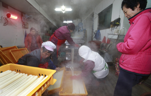 이른 아침 쌀을 쪄낸 수증기가 하얗게 피어오르는 떡방앗간에서 나오는 가래떡을 바라보는 할머니의 입가에 웃음이 배어나온다. 설을 8일 앞둔 1월23일 경기도 양평군 양서면 양수리의 떡집은 설에 찾아올 가족과 나눌 가래떡을 뽑으러 나온 할머니들의 행복한 설렘으로 가득하다. 떡을 찌는 동안, 오래 한동네에서 살아온 주민들은 서로 안부를 묻고 자식 자랑을 하다 이내 예전보다 팍팍한 삶을 사는 자식들을 걱정하며 한숨을 쉰다. 대를 이어 48년째 운영되는 이 떡집의 주인 이금섭(74)씨는 “요즘은 직접 가래떡을 뽑아 먹는 것보다 사먹는 사람이 늘었다. 아직까지 설에 찾아올 자식들에게 전해줄 가래떡을 뽑는 이들이 여전한 걸 보면 부모의 자식 사랑은 변함없는 것 같다”며 바쁜 일손을 놀린다.