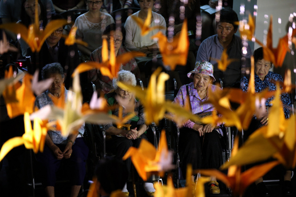 6월19일 서울 성동구 한양대박물관에서 열린 ‘울림-일본군 위안부 피해자들의 이야기’ 개막 전시장을 장식하고 있는 종이학 사이로 위안부 피해자 할머니들의 얼굴이 한없이 어두워 보인다. 종이학은 우리나라에선 행운의 상징이지만 일본에서는 억울하게 죽은 영혼을 달랜다고 한다.
