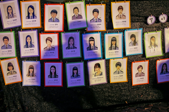 세월호 참사 200일을 사흘 앞둔 10월29일, 세월호 295번째 희생자 황지현 학생이 가족의 품으로 생일날에 돌아왔다. 이날 저녁 경기도 안산 화랑유원지에서 안산 지역 주민과 시민단체, 희생자 가족들이 ‘세월호 참사 200일, 기억과 행동 이 길에 서다’를 제목으로 희생자들을 위해 쌀쌀한 밤 촛불을 켜서 들었다. 이날 열린 문화제 장소 한켠에 걸린 단원고 희생자들의 초상화가 행사장 조명에 빛나고 있다.