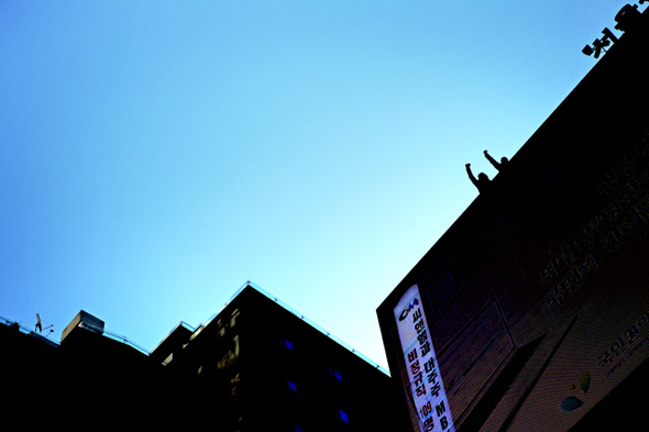 애초 그들은 정규직이었다. 2007년 회사가 외국자본인 MBK에 팔리면서 기술직군이 아웃소싱됐고 그들도 하청업체의 비정규직이 됐다. 노동환경은 나빠졌고 수입도 줄었다. 씨앤앰은 지난 7월 새로운 외주업체와 계약를 맺고 비정규직 노동자 109명을 해고했다. 졸지에 일자리를 잃은 이들은 MBK 사무실이 있는 파이낸스센터 앞에서 고공의 노숙농성을 시작했다. 서울의 공기가 급격히 얼어붙던 날 새벽이었다. 허공으로 기어오를 수밖에 없었던 이들은 해고자 복직 문제가 해결되기 전에는 내려오지 않겠다고 한다.