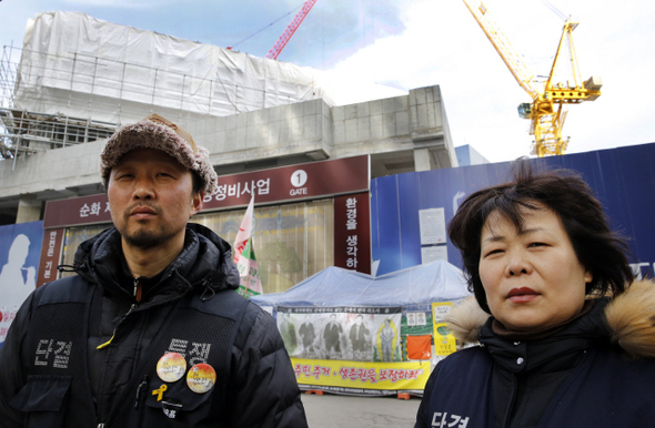 2007년 말 옛 건물이 철거된 뒤 롯데건설이 주상복합건물을 짓고 있는 서울 중구 순화동 1-1구역. 이곳에선 용산 참사 때 숨진 윤용헌씨의 부인 유영숙(55·사진 오른쪽)씨와 당시 남일당 건물에서 추락해 다친 지석준(45)씨가 작은 천막을 쳐놓고 시공사인 롯데건설을 상대로 생존권 보장을 요구하고 있다. 고 윤용헌씨와 지석준씨는 원래 중구 순화동(순화 제1-1구역 도시환경정비사업) 철거민이었다. 둘 다 전국철거민연합 소속이었고, 참사 전날 용산 철거 지역 망루 농성에 연대하러 갔다가 참사를 겪으며 정작 자신의 일은 돌보지 못했다. 지씨는 “아빠가 용산 참사로 다친 것을 아는 아들은 내가 투쟁에 나서는 걸 정말 싫어해요. 그렇지만 여기서 멈추면 아들에게 해줄 말이 없잖아요. 꼭 이겨서 아들에게 내가 왜 싸웠는지 얘기해주고 싶어요”라고 말한다. 유씨도 “남편은 가게가 철거된 뒤 내 권리를 꼭 찾겠다고 말하며 용산 제4구역 철거민과 함께 한강로 남일당 건물 망루에 올랐다. 하늘에 있는 저희 남편이 도와줄 거예요”라고 말을 이었다. 재개발로 한 가정의 가장은 죽었고, 또 한 가정의 가장은 평생 장애를 안고 살게 됐다. 순화동에서 용산으로, 다시 순화동으로 돌아와 벼랑 끝에 서 있는 두 사람에게도 평화가 찾아오길 바란다.