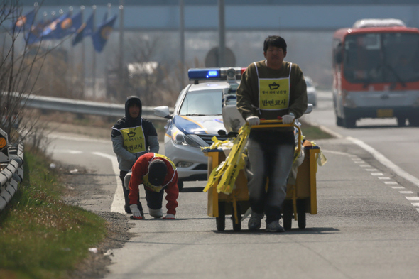 세월호 희생자인 경기도 안산 단원고 2학년8반 고 이승현군의 부친 이호진씨(허리 숙인 이)와 누나 아름양이 지난 2월24일부터 선체 인양을 촉구하며 전남 진도 팽목항에서 삼보일배를 시작했다. 서울 광화문까지는 약 500km. 하루 3~4km를 걷지만 유가족들의 몸이 지쳐가면서 그 속도는 점차 더뎌지고 있다. 오는 6월 광화문에 도착할 예정이었지만 더 늦춰질 것으로 보인다. 삼보일배 27일째인 3월20일, 세월호 모형배를 수레로 앞세운 행렬이 전남 목포를 지나가고 있다.