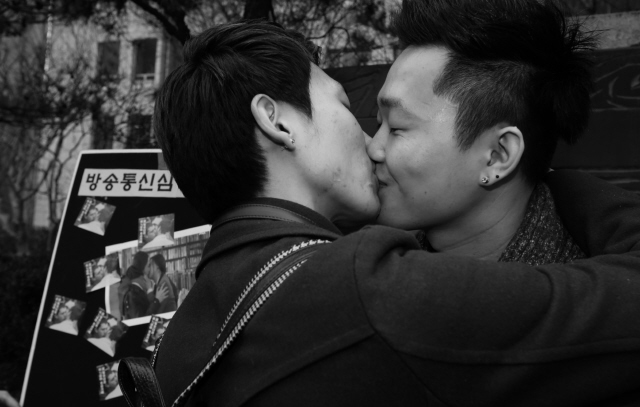 지난 3월30일 서울 목동 방송통신심의위원회(방심위) 건물 앞에서 성소수자차별반대무지개행동이 주최한 ‘<선암여고 탐정단> 동성키스 장면 검열반대 기자회견’이 열렸다. 방심위는 JTBC 드라마 <선암여고 탐정단>에 나온 여고생 키스 장면에 대해 지난 3월18일 방송심의소위원회를 열었다. 이날 심의보다 발언이 화제였다. “다수와 다른 정신적 장애를 앓고 있다고 생각한다”(함귀용 위원), “잘못하다가는 청소년들에게 (동성애를) 권장할 수도 있고 조장할 수도 있다”(고대석 위원). 기자회견에서 이종걸 친구사이 사무국장은 “동성애자들은 왜 방송에서 손만 꼭 잡고 있어야 하느냐”며 “오히려 키스 장면은 성소수자의 삶을 그대로 보여준다는 면에서 인권교육 효과가 크다”고 말했다. 그리고 참가자들은 키스 퍼포먼스를 벌였다.