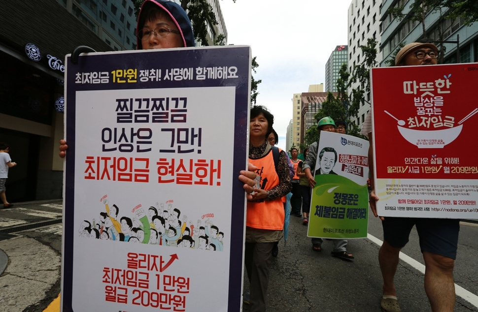 집회 참가자들은 “대한민국 노동자 절반이 비정규직·저임금 노동자로 월 200만원도 안 되는 돈으로 생계를 꾸리고 있다”며 “최저임금은 1만원으로, 월급은 209만원으로 올려 최소한의 인간다운 삶을 보장해야 한다”고 주장했다. 이들은 집회 뒤 동화면세점 앞을 출발해 청계광장을 거쳐 국가인권위원회 앞까지 1개 차로를 이용해 행진했다.