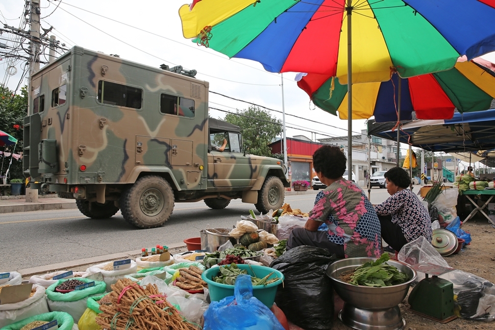 남북이 서부전선에서 서로 포격을 벌인 뒤, 날선 공방으로 긴장이 이어지고 국지적 충돌 가능성도 높아지고 있다. 북한이 포격에 이어 전선지대에 준전시상태를 선포하자, 박근혜 대통령은 제3야전군사령부를 방문해 철저하고 단호한 대응을 지시하며 맞서고 있다. 반면 포격이 일어난 다음날인 8월21일, 접경지역인 경기도 연천군 신서면 대광리엔 평소와 다름없이 장이 섰다. 5일장에 좌판을 벌인 상인들이 장터 앞 도로를 지나는 군 차량을 쳐다보고 있다.