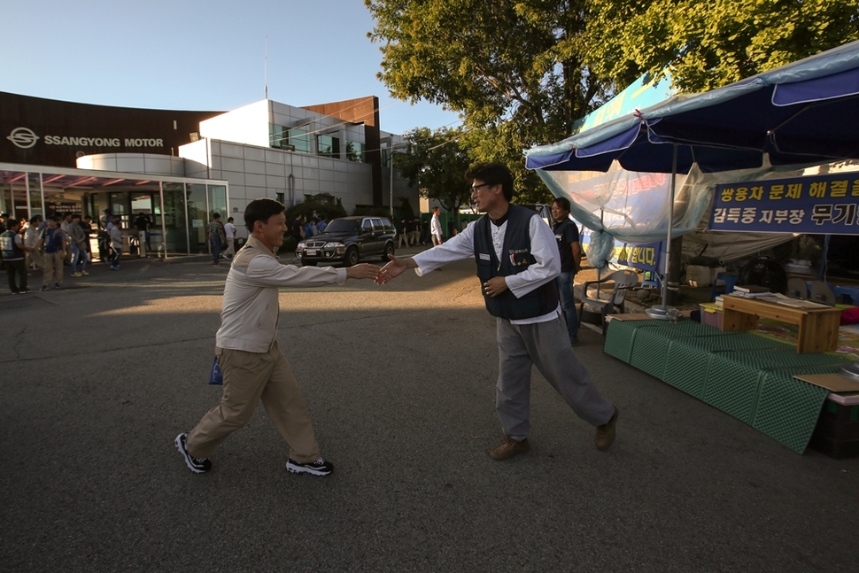 두 사람이 반갑게 다가서며 악수를 나눈다. 본래 한솥밥을 먹던 그들이지만 지금은 처지가 다르다. 한 사람은 하루 일과를 마치고 일터를 나서고 있다. 다른 사람은 그 일터에서 일하기 위해 6년을 기다렸고 지금은 무기한 단식을 하고 있다. 단식을 하는 이는 김득중 금속노조 쌍용차지부장이다.