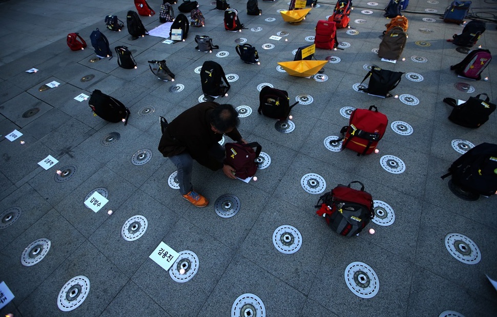 대학수학능력시험이 치러진 11월12일 오후 서울광장에서 세월호 참사로 희생된 250명의 학생을 추모하는 ‘250개의 책가방 모으기’ 행사가 열렸다. 풀뿌리시민네트워크와 4·16연대 광화문위원회의 주최로 열린 이번 행사에서 시민들이 자발적으로 가져온 가방으로 학생들의 이름이 쓰인 자리를 채우고 있다. 아이들은 세월호 참사가 없었다면 지금 고3이 되어서 시험을 치렀을 것이다. 같은 날, 대법원은 학생들을 버리고 도주한 이준석(70) 세월호 선장에게 무기징역형을 확정했다.