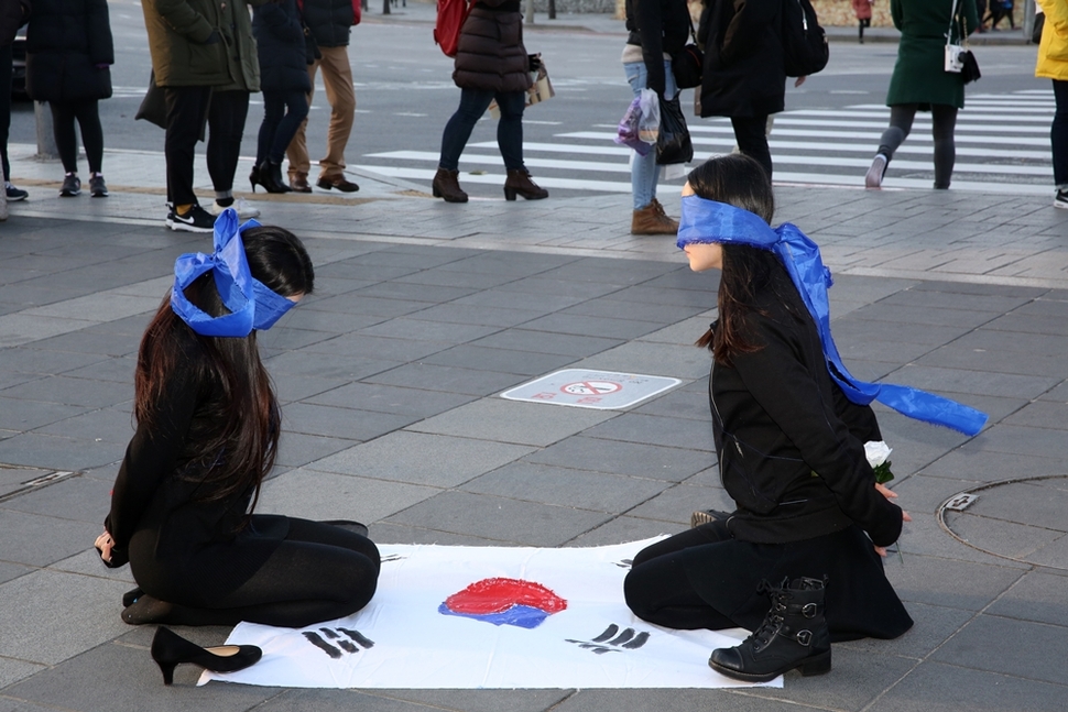 12월16일 오후 배인석 작가 외 6명이 참여한 ‘7인의 사무(또)라이전’이 서울 종로구 관훈동 가나인사아트센터에서 열렸다. 참여 작가 홍승희씨와 효은씨가 인사동 거리에서 모든 예술에 대한 검열 반대와 자유로운 집회 보장을 요구하는 퍼포먼스를 하고 있다.