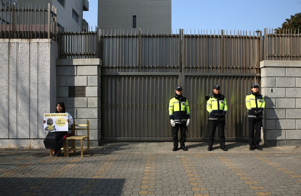1월15일 낮 부산 동구 초량동 일본영사관 후문. 부산 교대생 김지희(25·여)씨의 양 볼과 손끝이 빨갛게 얼어 있었다. 살짝 까치발을 든 것까지 소녀상과 같은 모습으로 1시간 내내 꼼짝하지 않았다. 그의 옆에는 빈 의자가 놓여 있었다. 세상에 드러나지 않은 피해자를 위한 자리이자, 아픔에 공감하자는 취지로 만들어졌다. 김씨는 “우리 또래들도 일본과 정부에 분노하고 있다는 것을 알리려고 나왔다”고 말했다. 우리겨레하나되기 부산운동본부는 무기한으로 1인시위와 수요집회를 한다.