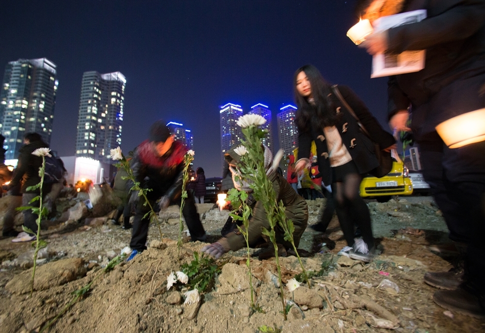 용산 참사 7주기 추모 촛불 기도회가 열린 1월21일 저녁, 서울 용산구 한강로 옛 남일당 터에 참석자들이 희생자를 추모하는 꽃을 꽂고 있다. 높고 화려한 건물이 들어선 주변과 달리 사고 현장은 개발사업이 지연돼 몇 년째 주차장으로 쓰이고 있다. 현장에 모인 시민들은 7년 전 참사의 진상 규명과 책임자 처벌, 국가폭력 중단을 요구했다.