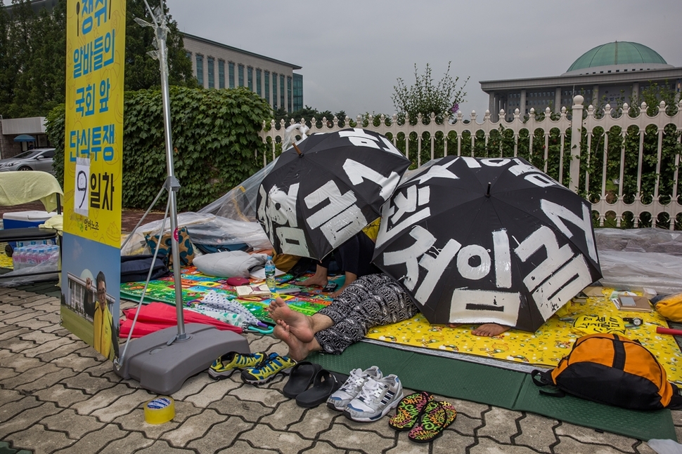 박정훈 알바노조 위원장과 조합원들이 6월24일 서울 여의도 국회 앞에서 ‘최저임금 1만원을 위한 알바들의 1만 시간 단식농성’을 하고 있다. 그늘 하나 없는 국회 정문 앞 보도블록 위에서 한뎃잠을 잔 지 9일째다. 비닐을 덮어 비를 피하고 우산과 밀짚모자로 볕을 가렸다. 박 위원장과 알바노조 조합원들은 최저임금위원회가 내년 최저임금을 결정할 때까지 단식을 이어간다.