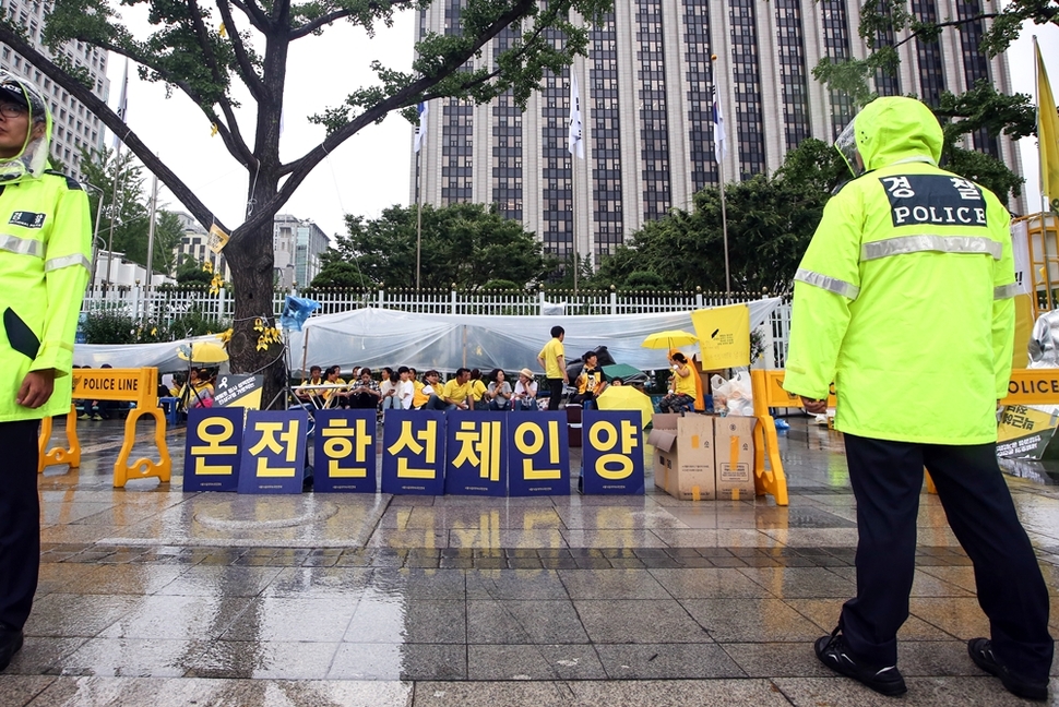 비 오는 7월1일 오후, ‘4·16세월호참사 가족대책협의회’가 서울 광화문 정부서울청사 앞에서 농성하고 있다. 이들은 ‘4·16세월호참사 특별조사위원회’ 강제 종료 저지, 세월호의 온전한 인양, 진상 규명 특별법 개정 등을 촉구했다. 정부는 6월30일로 세월호 특조위의 활동 종료를 통보했다. 정부 방침을 따르자면, 세월호 특조위는 더 이상 진실을 규명할 수 없다. 7월1일부터 3개월간 종합보고서와 백서 발간만 가능하다. 세월호 참사 유족들의 좌절감이 더욱 깊어지고 있다.
