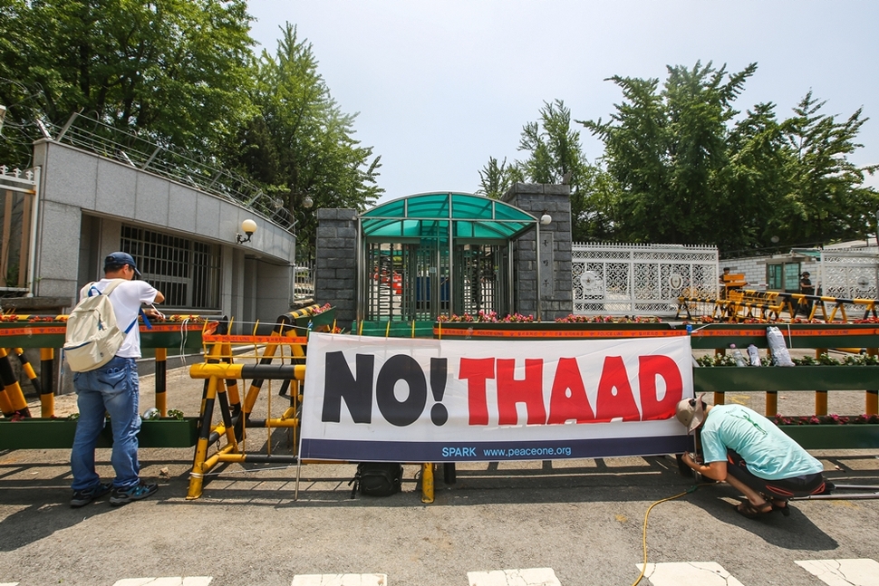 한·미 공동실무단이 7월8일 고고도미사일방어체계인 사드(THAAD)를 한국에 배치하겠다고 공식 발표했다. 최대 2천km에 달하는 사드 레이더 탐지거리 안에 자국 영토가 포함되는 중국과 러시아는 크게 반발했다. 중국 외교부는 이날 곧바로 “사드 배치에 반대한다”는 성명을 냈다. 사드 배치 지역도 문제다. 사드 레이더는 강력한 전자파를 뿜어내 사람과 주변 환경에 나쁜 영향을 주는 것으로 알려졌다. 사드 배치 지역으로는 경북 칠곡, 경기도 평택 등이 유력하게 꼽힌다. ‘사드 한국 배치 반대 전국대책회의(준)’ 회원들은 이날 서울 용산구 국방부 앞에서 기자회견을 열고 “사드가 동북아 평화를 파괴하고 안보 위협을 초래할 것”이라며 ‘NO! THAAD’라고 적힌 현수막을 내걸었다.