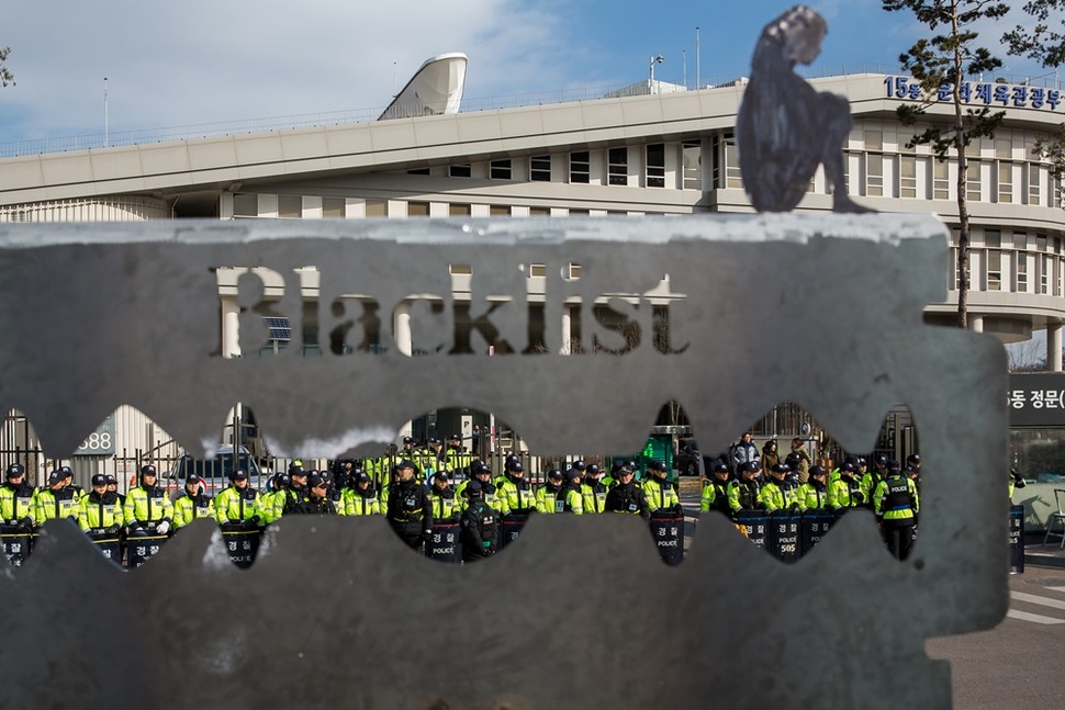 1월11일 정부가 작성한 문화예술인 블랙리스트에 항의하기 위해 문학·연극·미술 분야 문화예술인들이 세종시 문화체육관광부 앞에 모였다. “표현의 자유, 상상의 자유는 우리에게 목숨 같은 것이다. 그것을 막는다는 건 우리에게 죽으라는 얘기다.” 박근혜 정권의 대표적인 탄압 예술가 이하 작가의 말은 또렷했다. 이들은 머리에 검은 봉투를 뒤집어쓰고 침묵시위, 조윤선 문체부 장관 흉상에 먹물을 뿌리는 퍼포먼스, 거리행진 등 항의 행동을 한 뒤 문체부 앞에 천막을 치고 1박2일 밤샘 노숙농성을 이어갔다.