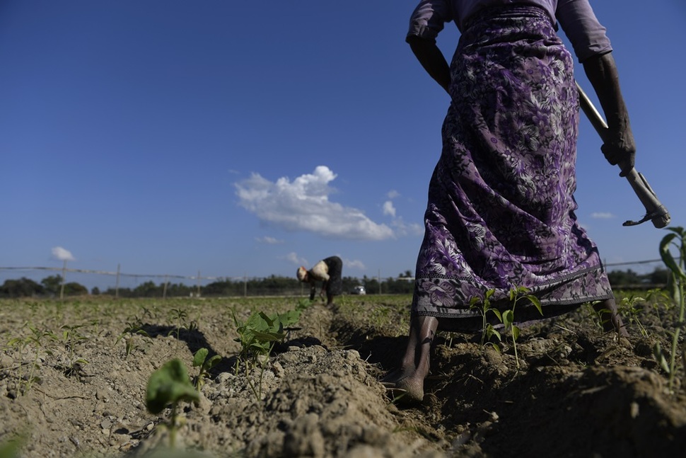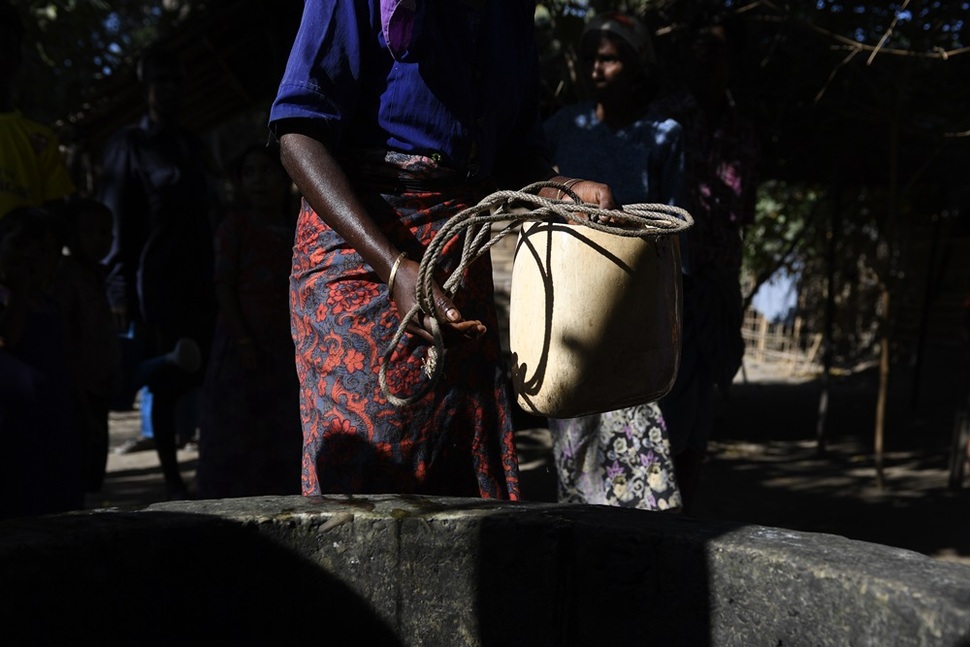 로힝야족 여성이 마을의 공동 우물에서 물을 긷고 있다. 대부분의 로힝야 마을에는 상하수도 시설이 없다.