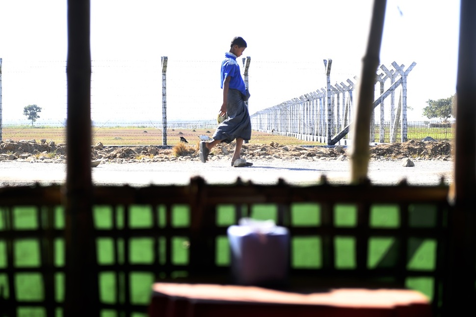 로힝야족 아이가 도로 포장을 위해 공사장으로 가고 있다. 카틴픽핀차이 마을 앞, 왕복 2차선 도로 포장에 로힝야족이 동원되고 있다. 라킨주 공무원 1명이 현장 감독을 하고 무장 경찰 3명이 옆을 지키고 있다. 아이들은 교육제도 밖에 방치돼 값싼 노동력으로 이용되고 있다.