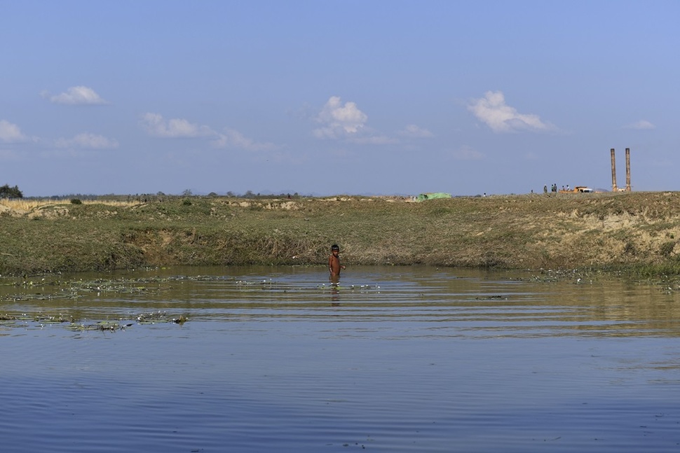 로힝야족 아이가 마을 근처 물 웅덩이에서 수영을 하고 있다. 열악한 환경에선 놀거리를 찾을 수 없고 아이들 교육도 보장해주지 못한다.