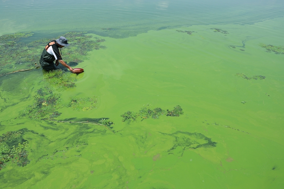 금강 유역 환경지킴이 김종술(51)씨가 지난 6월22일 오후 충남 논산시 황산대교 인근 강물에 들어가 바가지로 녹조를 떠서 살피고 있다. 김씨는 “녹조가 뒤엉켜 ‘녹조라테’를 넘어 ‘녹조 곤죽’이 됐다. 4대강사업으로 유속이 느려지면서 녹조가 심화됐다”고 말했다.