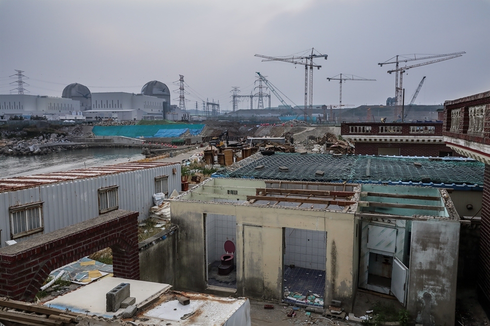 그렇지만 5·6호기 건설 현장 바로 앞 해안마을인 울산시 울주군 서생면 골매마을 16가구는 지난 5월 말 정든 집을 떠나야 했다. 골매마을 주민들은 1969년 고리원전 건설이 계획되면서 고향을 등져야 했고, 5ㆍ6호기 건설로 두 번째 집단이주를 해야 했다. 핵발전소 건설로 인간이 떠밀려나는 일은 언제까지 계속될까? 사진 오른쪽 타워크레인 지역은 건설 중인 5·6호기, 왼쪽 두 핵발전소는 현재 운영하는 신고리원전 3·4호기다.