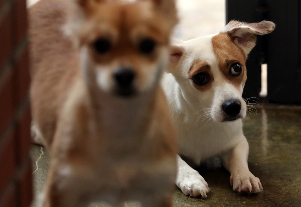 서울 마포구 서교동 동물보호시민단체 ‘카라’에서 운영하는 ‘더불어숨센터’ 입양카페엔 1년 전 임신한 상태로 버려진 바둑이(사진 오른쪽)가 생활하고 있다. 바둑이는 새끼 다섯 마리를 낳았다. 새끼는 모두 분양됐지만 바둑이는 여전히 남아 다른 유기견과 생활한다. 추정 나이 3살인 바둑이가 새 가족을 찾아 행복하게 살아가기 바란다.