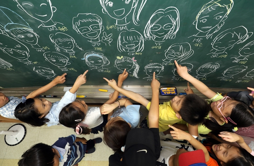 8월24일 초등학교 개학식날. 경기도 부천시 소사구 범박동 범박초등학교 3학년 5반 박소현(33) 교사는 칠판을 반 아이들의 얼굴로 가득 채웠다. 박 교사는 평소 칠판을 아이들이 좋아하는 낙서판처럼 꾸미고 싶었다. 방학식 전날 칠판에 반 아이들 몇 명의 얼굴을 그리다보니, 누구는 빠뜨릴 수 없어 모든 아이들의 모습을 채워넣었다.