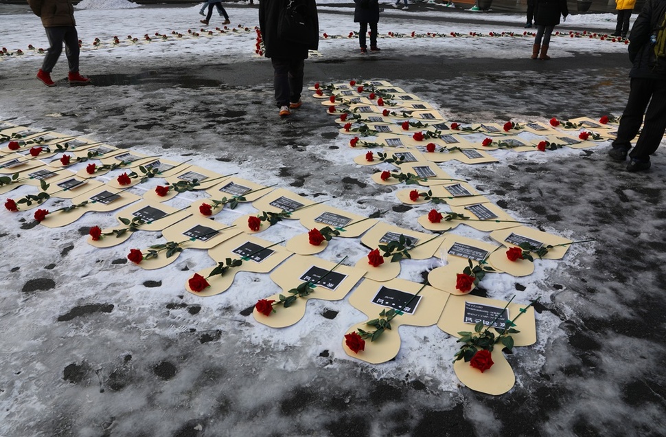 2017년 12월18일 오후 잔설이 남은 서울역 광장. 오가는 사람들 발길 밑으로 노숙인 사망자를 추모하는 얼굴 없는 영정과 장미꽃이 놓여 있다. ‘2017 홈리스추모제 공동기획단’은 동짓날 하는 추모제에 앞서 거리와 쪽방에서 삶을 마감한 이들을 기억하는 ‘홈리스 기억의 집’을 그렸다.