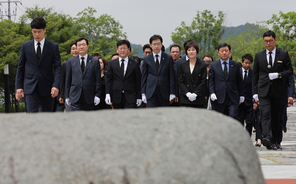 김경수 경남도지사 당선인(앞줄 가운데)이 6월14일 오전 부인 김정순씨(앞줄 오른쪽 세 번째)와 함께 경남 김해 봉하마을을 찾아 노무현 전 대통령 묘역에 참배하기 위해 너럭바위 쪽으로 걸어가고 있다. 앞줄 왼쪽 세 번째는 김경수 당선인의 경남도지사 출마로 보궐선거가 치러진 김해을 선거구에서 당선된 김정호 국회의원. 너럭바위 앞에서 큰절을 올린 김경수 당선인은, 방명록에 “대통령님과 함께했던 사람 사는 세상의 꿈, 이제 경남에서 다시 시작합니다. 편히 쉬십시오. 사랑합니다!”라고 적었다.